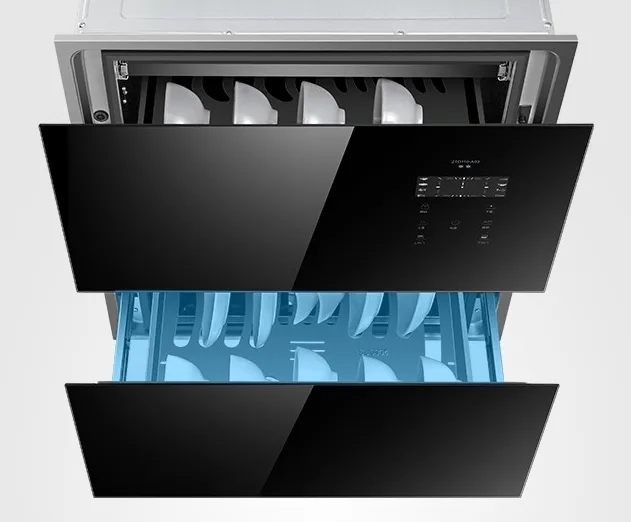 消毒柜主要由箱體、消毒裝置、烘干裝置、控制器等四大部分組成。其中控制器由電源板和按鍵顯示屏組成。按鍵顯示屏(大彩串口屏)可以按用戶的意愿來要求消毒柜完成各項功能,其主要任務是選定功能,設定時間,控制消毒柜的消毒、烘干狀態。