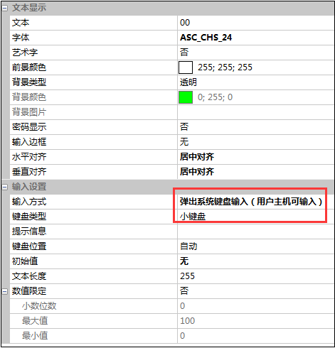(1) 文本控件主要是用于參數的輸入,對應的輸入方式設置成系統鍵盤輸入。相應的屬性設置如圖3-2所示。