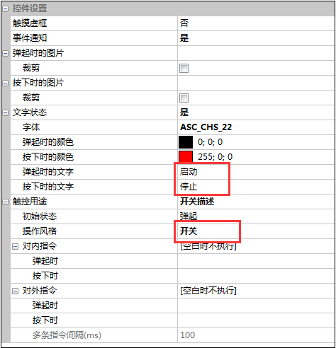 (2) 按鈕控件主要是用于觸發動作的操作,按鈕控件有兩個狀態:彈起/按下,操作風格設置成開關,彈起狀態是啟動,按下狀態是停止;相應的屬性設置如圖3-3所示。