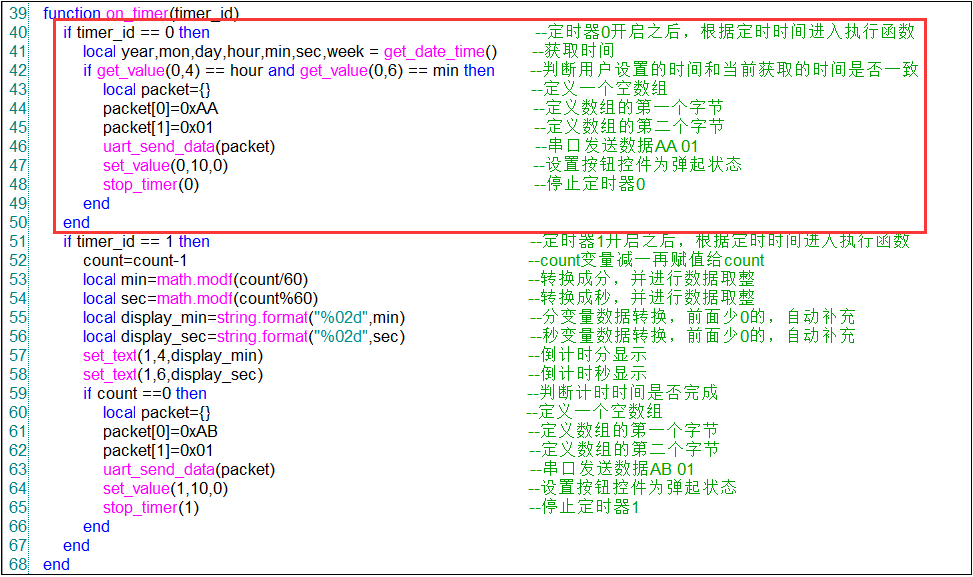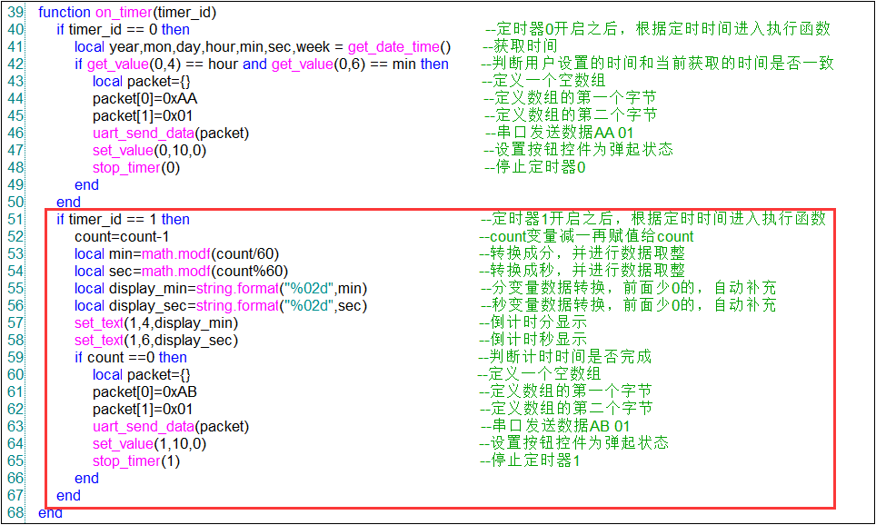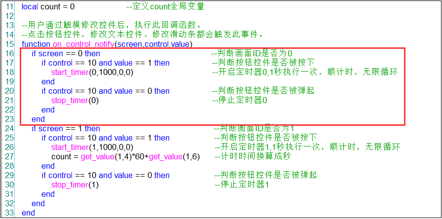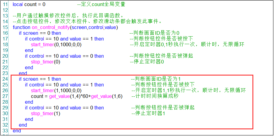 腳本實現的思路:通過控件通知函數on_control_notify(screen,control,value)來執行按鈕按下或者彈起的操作,同時將設置的時間值轉化成秒變量count,然后對應開啟定時器start_timer(timer_id,timeout,countdown,repeat)進入到on_timer(timer_id)的函數,按照相應的timer_id來執行操作。通過定時一秒進入一次on_timer(timer_id),每次進入都會觸發count的值減1,當count等于0就代表計時時間達到了,對應就會觸發uart_send_data(packet)發送串口指令AB 01。相應的變量函數如圖4-2,圖4-3所示。