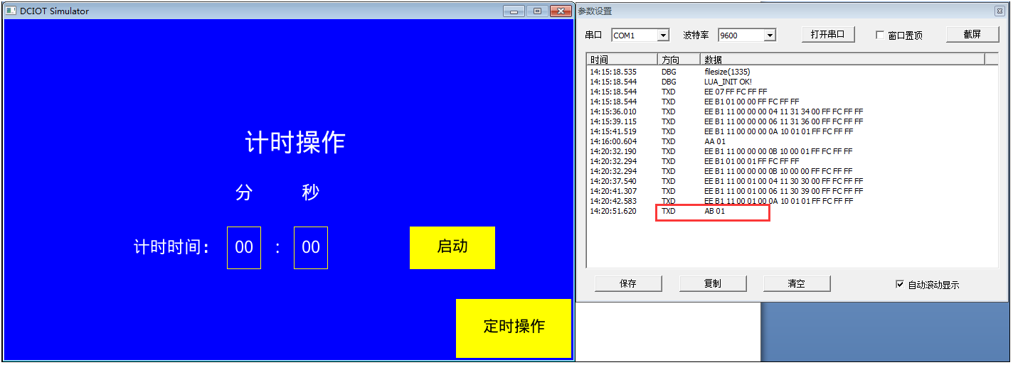 工程設置完畢之后,可以通過虛擬屏來調試編寫的lua腳本,用戶在設置完相應的計時時間,當計時時間為0的話,虛擬屏串口會發出AB 01的指令,如圖5-2所示。