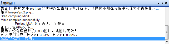 在我司的上層軟件Visual TFT中集成了LUA程序的編譯器,可以實現在編譯工程的同時將LUA腳本程序一起編譯,并且將編譯后的圖片和程序集合在一個名為DCIOT.PKG的文件中。編譯后只需要把DCIOT.PKG文件拷貝到U盤中,插入串口屏并重新上電即可將圖片和程序下載到屏中。