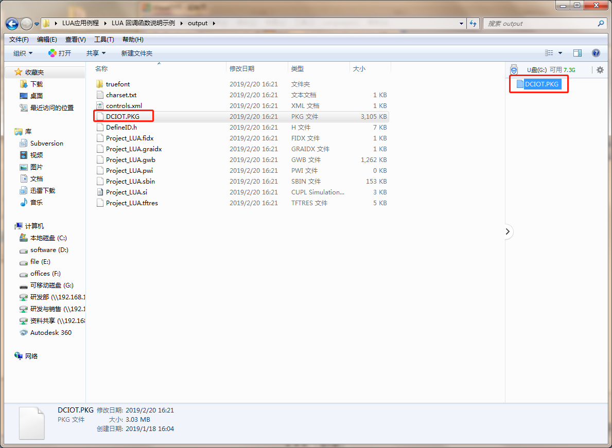 工程編譯成功后在輸出窗口會提示編譯成功,如所示。編譯成功后打開工程目錄,找到output文件夾,將文件夾中的DCIOT.PKG文件拷貝到U盤中,如圖 5-4和圖 5-5所示;接上串口屏重新上電,等到提示燒錄工程成功后,拔掉U盤重新上電即可。