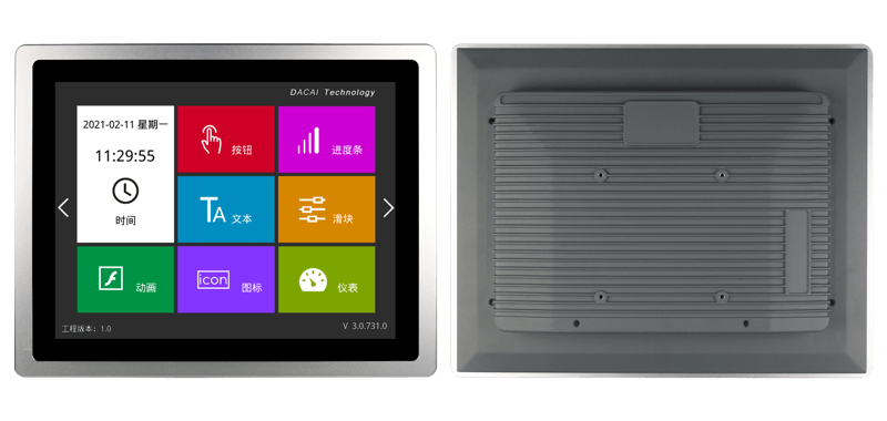 該產(chǎn)品擁有12.1寸液晶屏,分辨率有1024*768,顯示區(qū)域尺寸245.7mm*184.5mm,全視角顯示,支持電容觸摸。擁有炫酷的動(dòng)畫效果,頁(yè)面切換流暢。使用立體聲喇叭,可以播放語(yǔ)音、視頻。