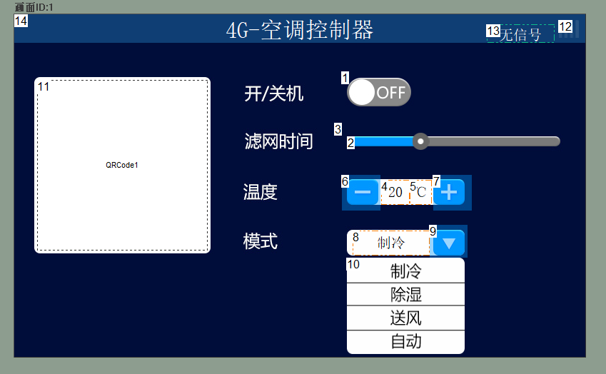 APP 交互的變量:控件ID1~ID10用于顯示、設置開/關機、濾網時間、溫度、設備模式等。畫面配置如圖5-3所示: