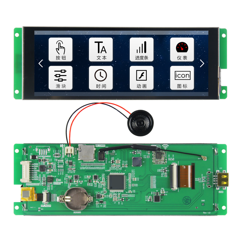 該產品擁有6.8寸液晶屏,分辨率有1280*480,支持電容觸摸。擁有炫酷的動畫效果,頁面切換流暢。使用立體聲喇叭,可以播放語音、視頻;可配置Wi-Fi聯網。
