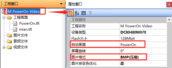 雙擊工程名稱,顯示工程屬性窗口,將啟動畫面選擇為開機視頻畫面、圖片格式默認為BMP(壓縮),如圖5-3所示。