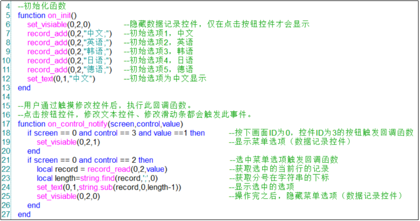 本例子主要是結(jié)合數(shù)據(jù)記錄控件可以通過串口靈活更新的特點,直接用數(shù)據(jù)記錄控件替代菜單控件,同時使用lua腳本來處理按鈕控件的下拉菜單的功能,并可以將選中的選項顯示文本控件。通過數(shù)據(jù)記錄控件的靈活更新功能并結(jié)合lua腳本的邏輯應(yīng)用,可以有效實現(xiàn)串口更新菜單選項的功能。