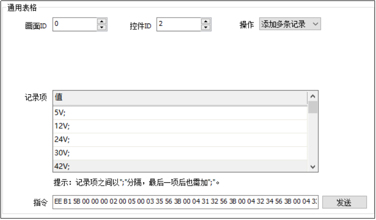 添加多條記錄指令就是一條指令更新多個選項的顯示。比如:將里面的選項更新成對應(yīng)的電壓參數(shù),相應(yīng)的指令參考圖3-7。