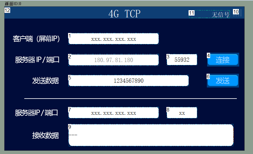 - 文本控件ID7~9:當服務器下發數據時,將相關信息顯示此處,依次為服務器的IP、端口、數據等