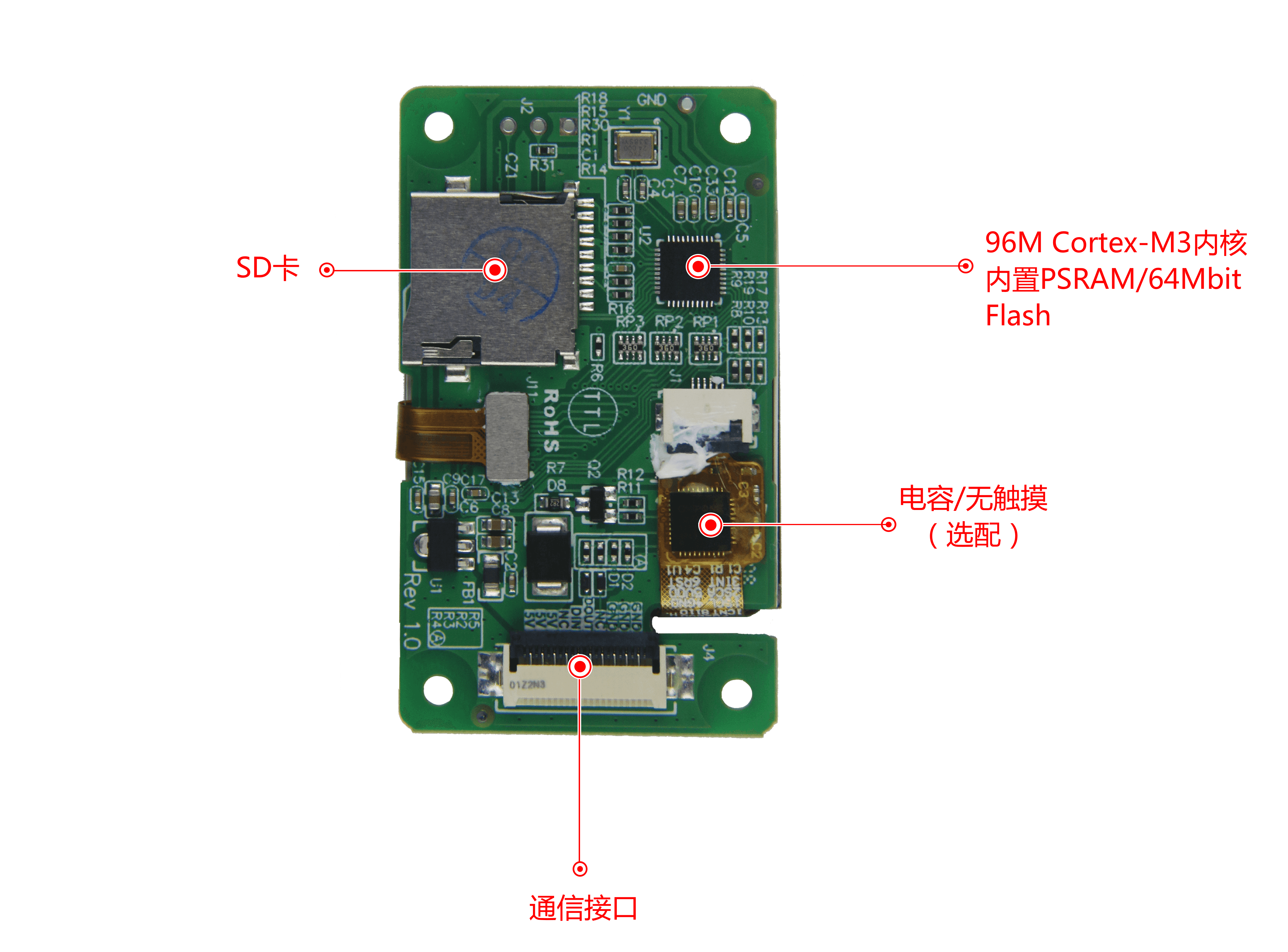 (1)采用96M主頻Cortex-M3內核處理器,內部集成PSRAM、FLASH,屏幕運行速度更快,上電即可運行